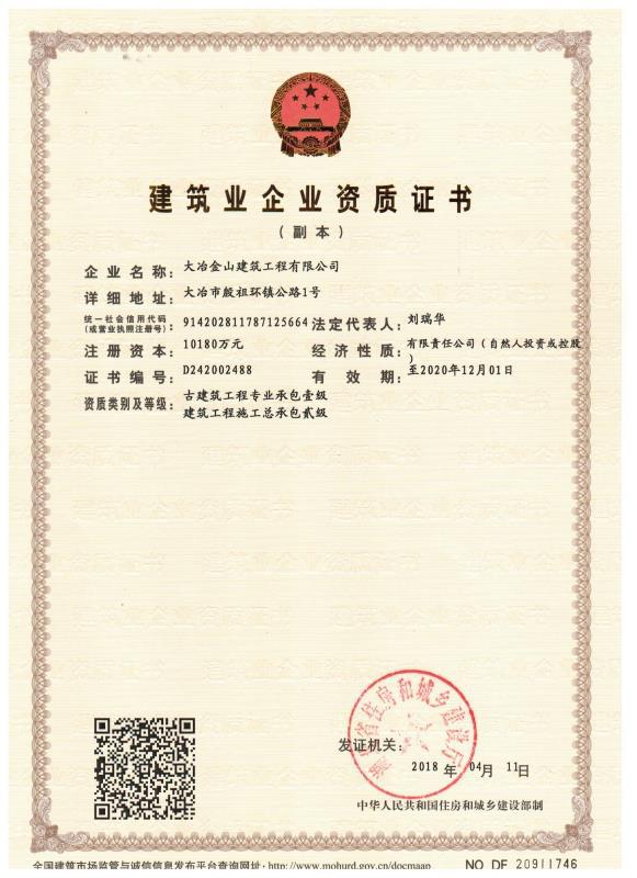 大冶金山建筑工程有限公司始建于1984年,屬鎮(zhèn)辦集體企業(yè)。1997年改制為大冶山建筑工程有限責任公司,屬股份制企業(yè)。2013年更名為大冶金山建筑工程有限公司,2018年3月公司資源重組,公司注冊資金達到10180.00萬元,公司法定代表人為劉瑞華。公司具有古建筑工程專業(yè)承包壹級、建筑工程施工總承包貳級、市政工程總承包叁級、鋼結(jié)構(gòu)工程專業(yè)承包叁級資質(zhì)。